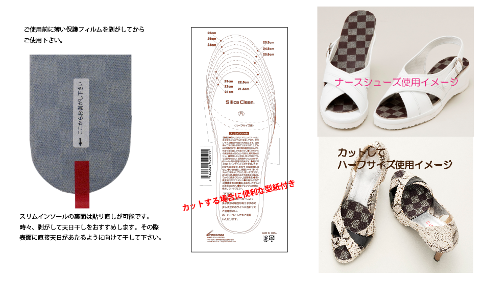 ●「シリカクリンスリムインソール」は、良質のシリカゲルを使用しており、天日に干すと機能が何度でも再生します。自然素材で繰り返し使用できますので、とてもecoな製品です。 ●従来のインソールよりも更に薄く(当社比40%)なっており、特殊な裏面加工により何度も張り直しが可能です。 ●シリカゲルの調湿機能が靴のムレを除き、靴を傷めません。 ●使用しない時は靴から取り出し、時々天日に干してご使用ください。使用条件にもよりますが、約2~3ヶ月の使用が目安です。 ●靴のサイズに合わせてカットしてご使用いただけます。 ●カットすることによりハーフインソールとしてもお使いいただけます。