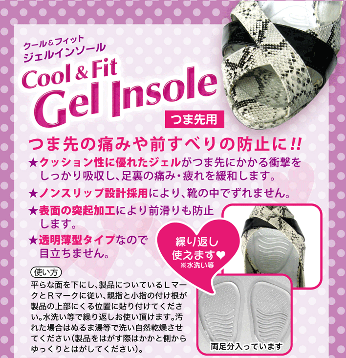 ・ジェルインソールを剥がす場合靴の中敷きや中敷きの色、柄がはがれる場合がありますのでご注意ください。