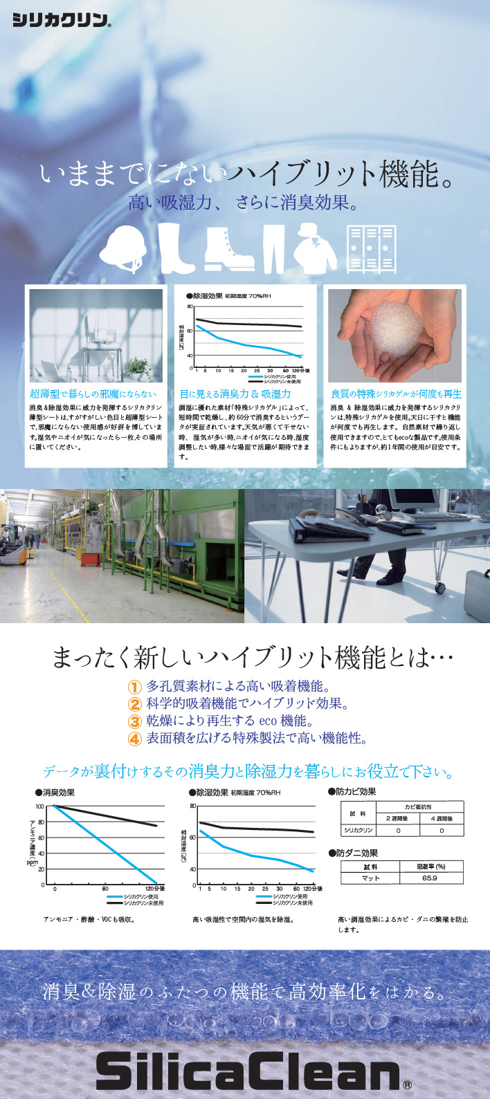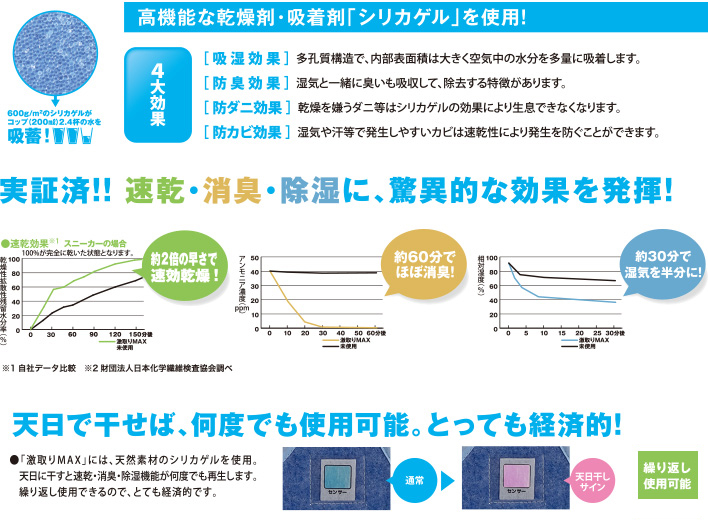天然素材のシリカゲルを素材として、特殊製法で製品加工されたシリカクリンは、検証データでも実証済みの明確な消臭力、除湿力を発揮し、もう、嫌な臭いに困ることはありません。また、その効果は、太陽光の力で再生する(エコ)ので1年近く繰り返し使えます。嫌な臭いにお悩みなら、今話題の除湿&消臭グッズ、シリカクリンを一度お試しください。